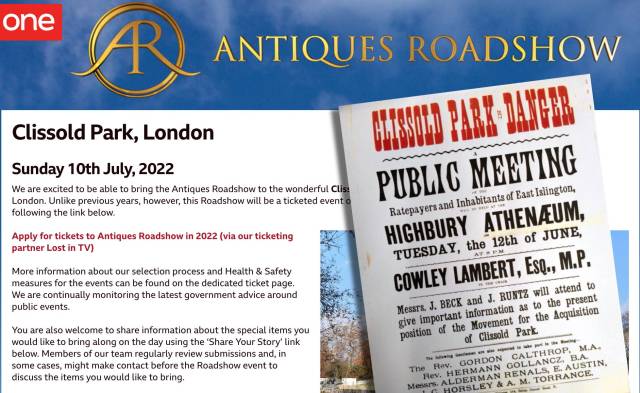 I helped the director and researcher of BBC’s Antique Roadshow with their research into the history of Clissold Park as part of the filming of three episodes there, which is taking place on July 10th. The first of three episodes filmed in the park was aired on October 9th. The other two episodes will be aired in 2023.