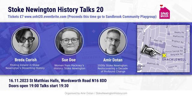 The 20th Stoke Newington History Talks event, which also marked the 7 year anniversary since the first event in 2016, was a great evening with 100 people in attendance and fascinating talks by Sue Doe and Breda Corish. Ticket sales from the event raised £678 for Sandbrook Community Playgroup, bringing the total raised for 12 charities in the last 13 events to £8,146.