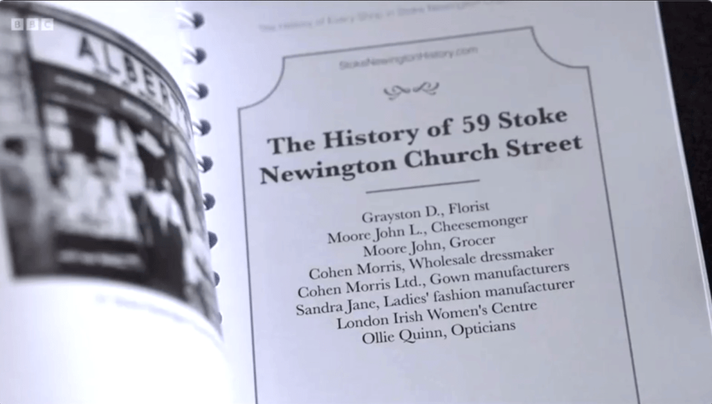 Since I first shared the 155-page book I created a few weeks ago for my research into the history of every shop in Stoke Newington Church Street, it has taken off, and I had the pleasure of filming a short segment about it with BBC London News. In this 2:30-minute piece, I describe the project, talk about a few shops, and visit two where the business owners talk about their shop. At the time of writing, nearly all 100 copies that were printed, thanks to Oakwood Estate Agents, have been given away for free. Five additional local businesses have offered to sponsor an additional 325 copies, which will be available for free from local shops.