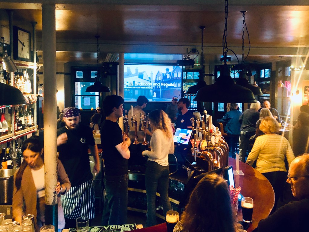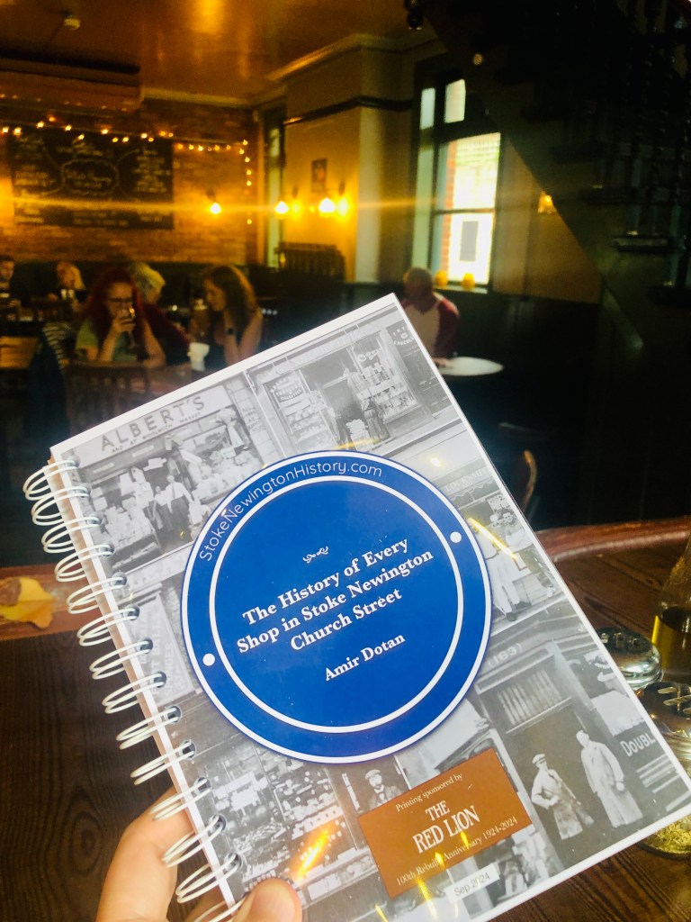I thoroughly enjoyed giving a 40-minute talk in a packed Red Lion in Stoke Newington Church Street about its long history, as part of ‘Red Lion Fest,’ marking 100 years since the current building was constructed after the 17th-century pub was demolished for road widening. The event, organised by the pub, included Craig McLean’s lively ‘Sorted for Beers & Quiz’ and raised £675 for St. Joseph’s Hospice through ticket sales and an auction. Cathie Brennan, whose parents ran the pub from 1969 to 1986, attended and shared vivid memories, having not visited in 42 years. Her appearance and stories were the icing on the cake.
