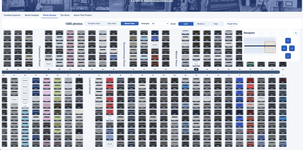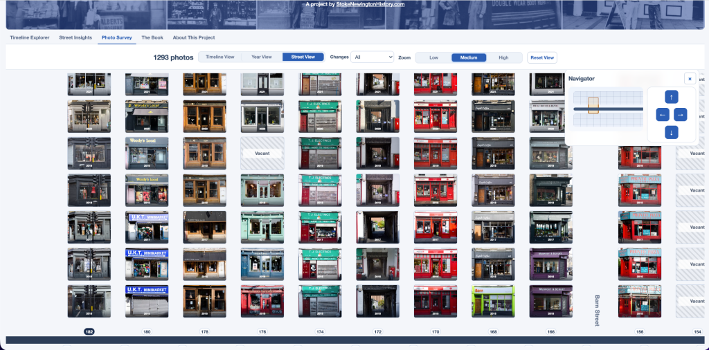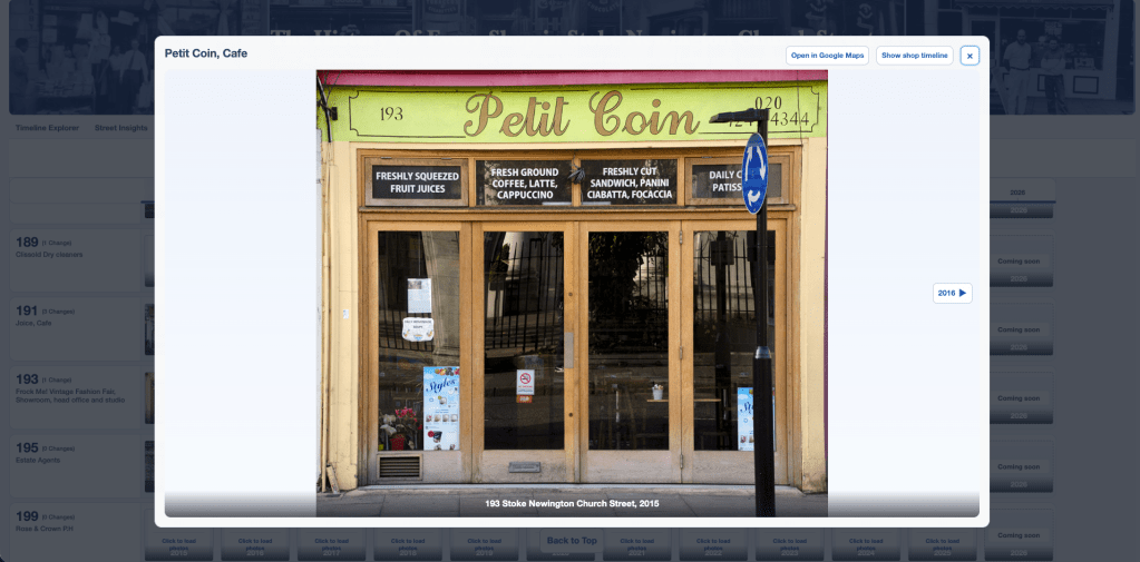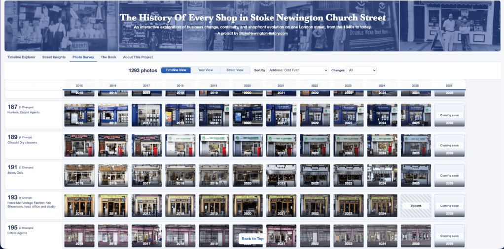 A major part of the project is also the photo survey, which brings together a growing visual record of Church Street’s shopfronts. This makes it possible to compare premises year by year and to see how the street has changed in appearance as well as in use. Together, these sections are intended to make the underlying research more open, navigable and useful, whether for local residents, researchers, or anyone with an interest in the changing life of Stoke Newington.