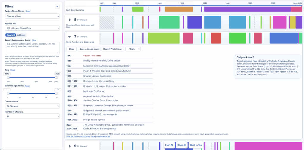 A new dedicated site is now live for The History of Every Shop in Stoke Newington Church Street, a major strand of my ongoing research into the commercial history of Church Street. Drawing on years of work documented in the master spreadsheet, it brings that research into a more accessible and engaging form through an interactive timeline that can be filtered and sorted in different ways, a photo survey of shopfronts, and an insight page that highlight wider patterns in occupancy, change and continuity from the 1840s to the present day.