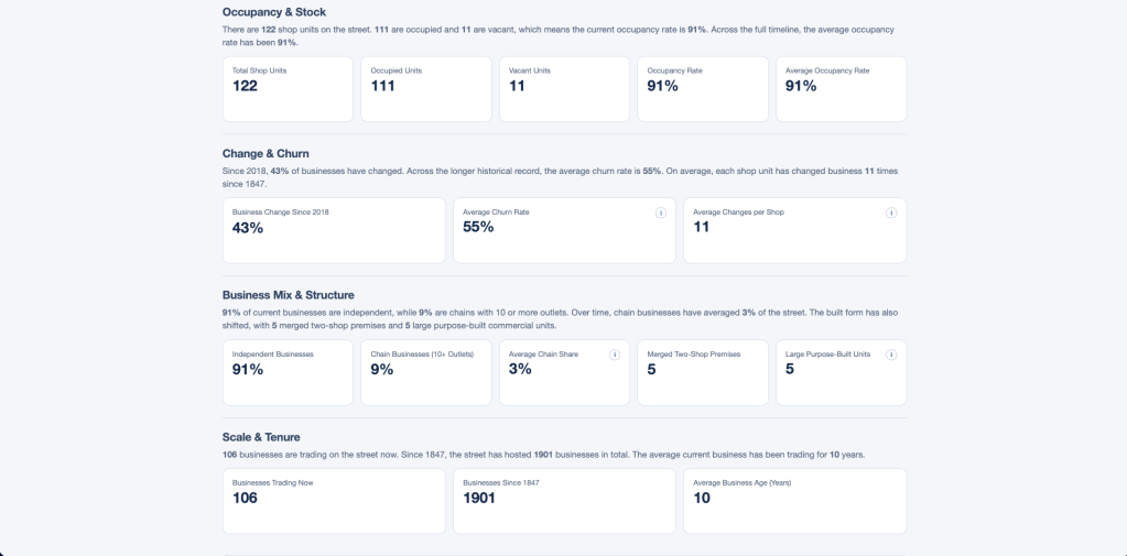 The new site is designed to make the history of Church Street easier to explore, whether you want to follow a single address, trace a business over time, or step back and look at broader patterns across the whole street. The interactive timeline allows users to browse each property across different periods, filter results, sort addresses, and focus on particular themes or types of change. Alongside this, the Street Insights section draws attention to long-term trends in occupancy, turnover, business mix and continuity, helping place individual shops within the wider commercial history of the street.
