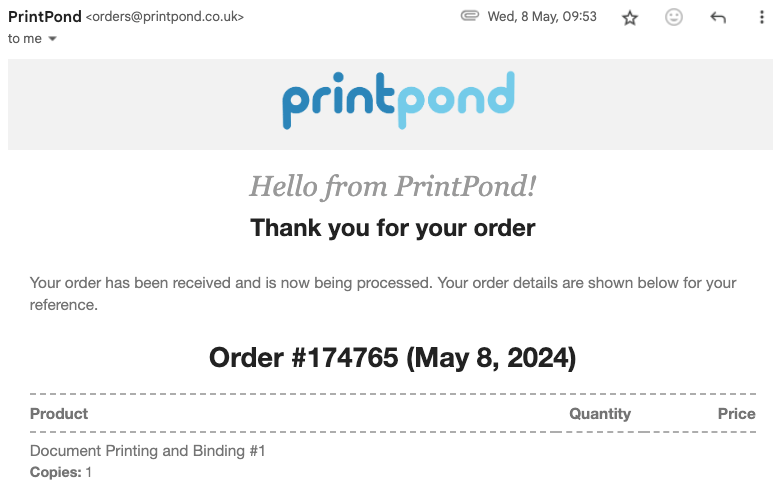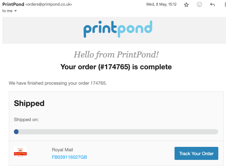 A day or two later a second email from PrintPond will inform you the order as been completed. The next emails you’ll receive will be from the courier company that’ll deliver the book or Royal Mail.