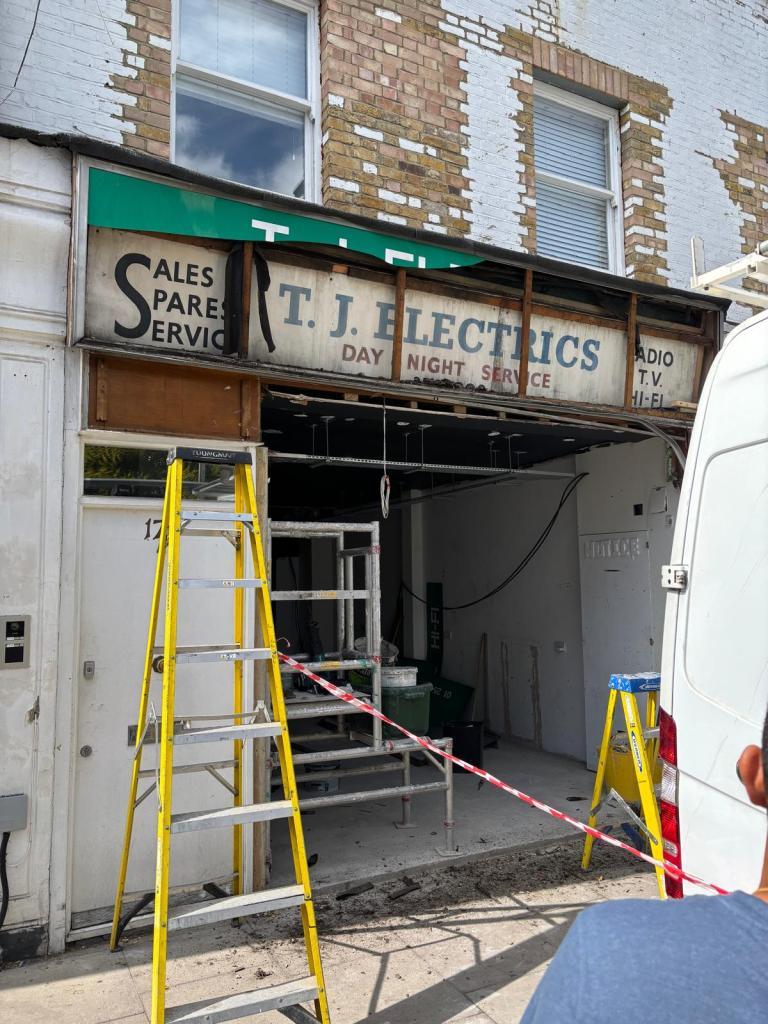 On 26 June 2025, renovation work at 174 Stoke Newington Church Street revealed an unexpected survival. When the existing shopfront was removed, three older signs were uncovered beneath it, including the long-familiar T. J. Electrics fascia and two earlier signs from previous businesses that had occupied the premises.
