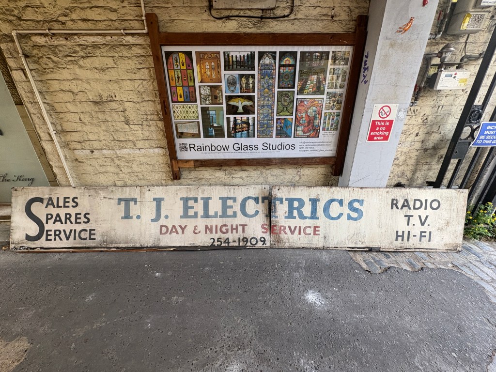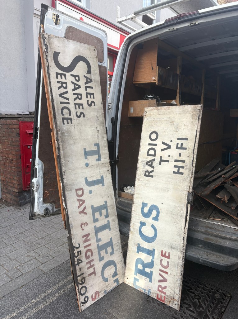 I managed to retrieve the T. J. Electrics sign before it was discarded and to save what remained of the others. The owner of Woody’s Local, who had taken over the premises to open a second shop on Stoke Newington Church Street, very kindly agreed to let me keep the sign. He later dropped it off at my house in the van, which made all the difference, as the sign consisted of two heavy pieces that would otherwise have been very difficult for me to transport. Without that intervention and help, all three signs would almost certainly have been lost during the clearance.