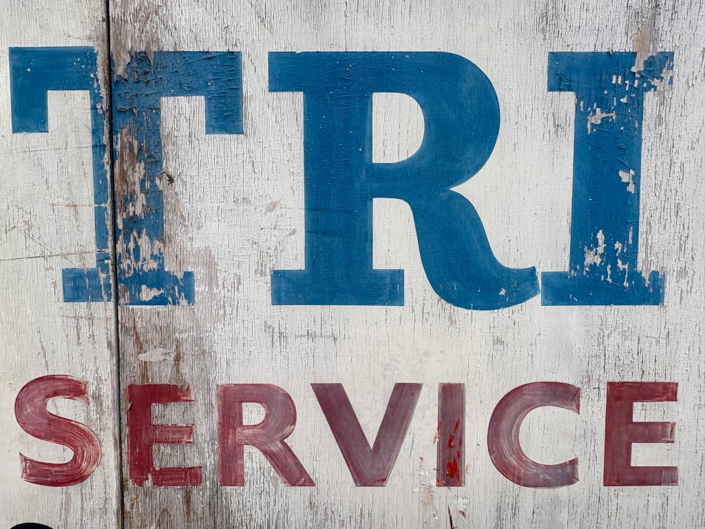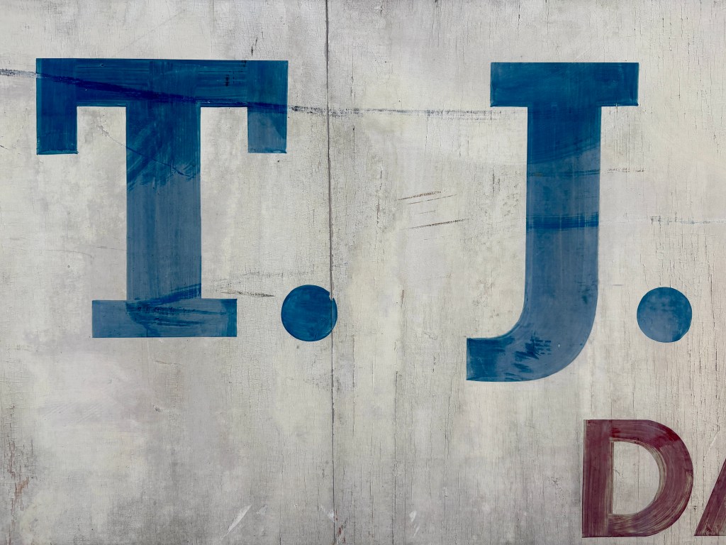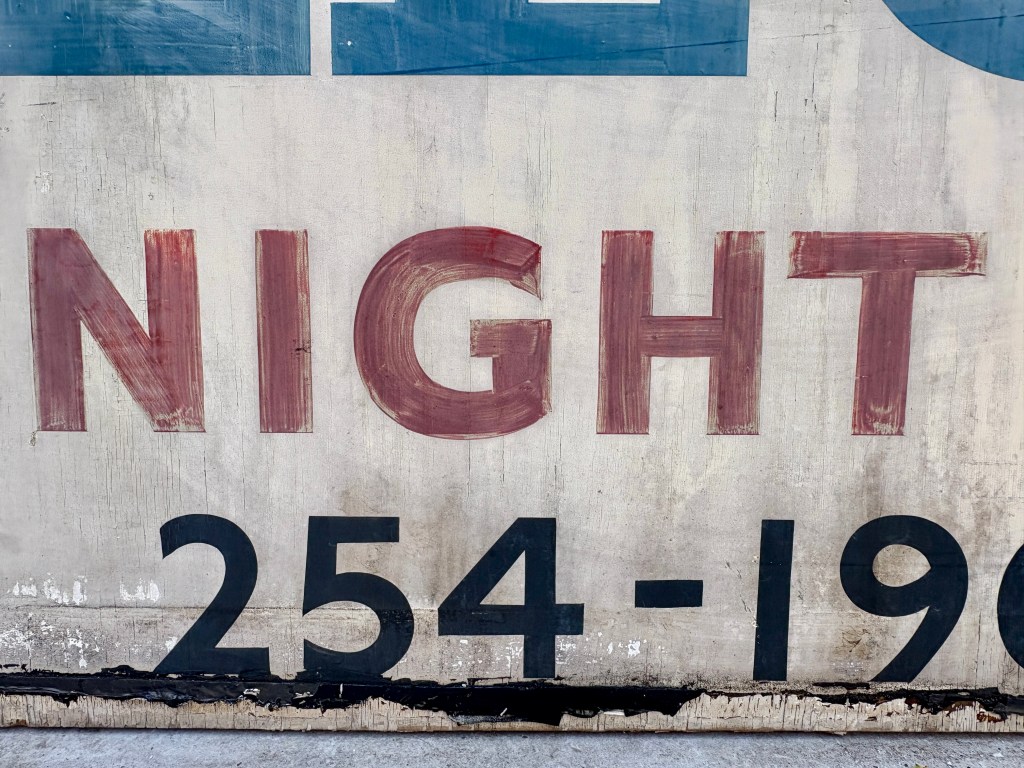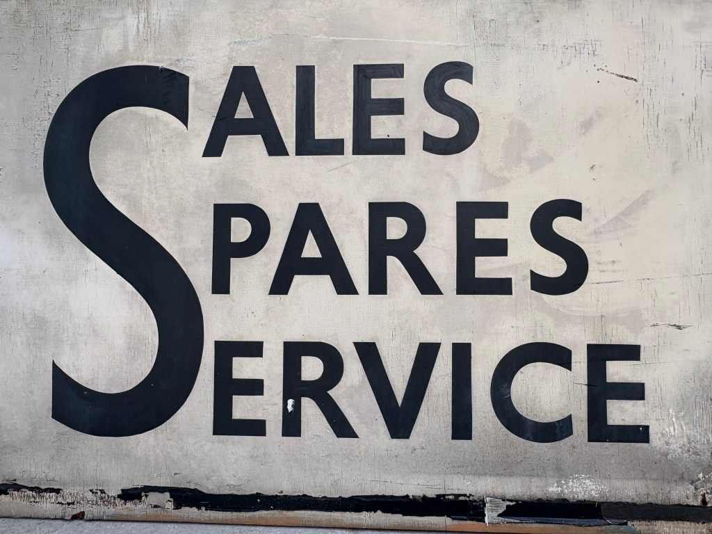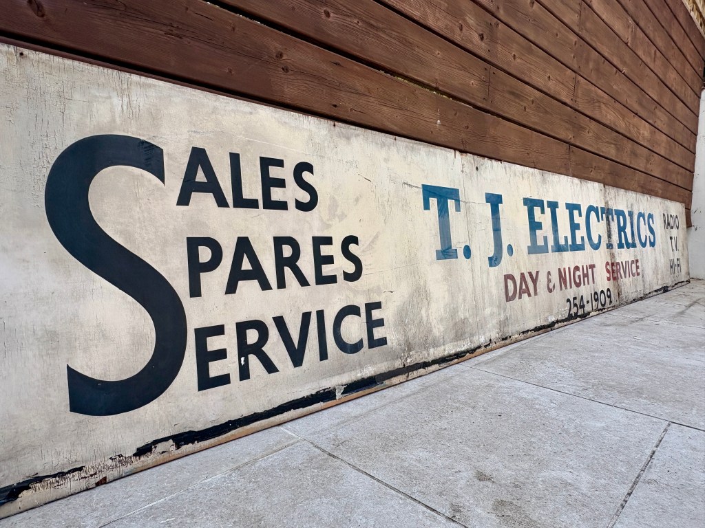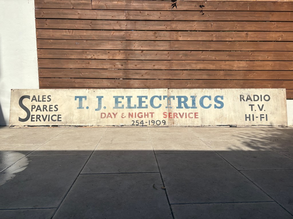Once cleaned, the rescued T. J. Electrics sign revealed more of its character. The painted lettering and visible brushwork showed the hand-painted craftsmanship that went into signs of this kind. Details like these are part of what make old shop signs worth preserving. They are not just remnants of former businesses, but surviving pieces of local visual history.